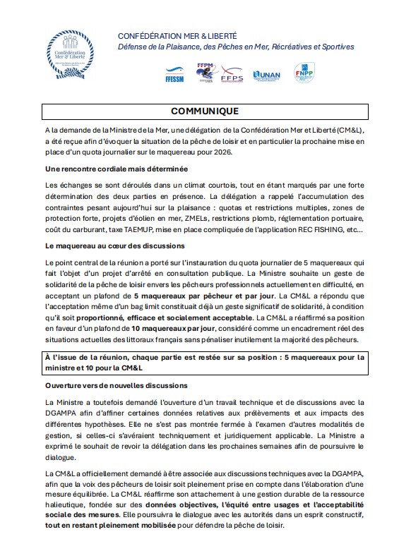 La Confédération Mer et Liberté a rencontré La Ministre de la Mer concernant principalement l’instauration d’un quota de 5 maquereaux par jour et par pécheur.